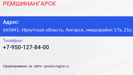 РЕМШИНАНГАРСК по адресу 665841, Иркутская область, Ангарск, микрорайон 17а, 21а в дальнейшем Организация, размещена в следующих категориях: