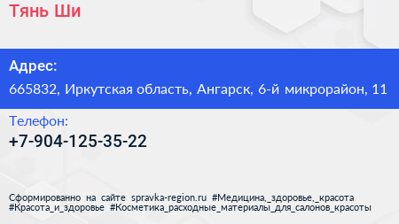 Тянь Ши по адресу 665832, Иркутская область, Ангарск, 6-й микрорайон, 11 в дальнейшем Организация, размещена в следующих категориях: