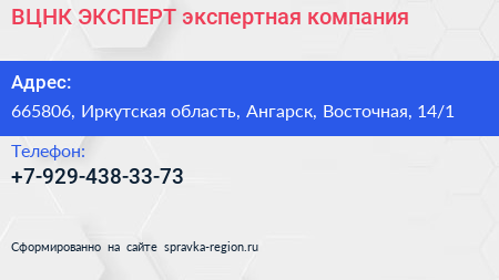 ВЦНК ЭКСПЕРТ, экспертная компания по адресу 665806, Иркутская область, Ангарск, Восточная, 14/1 в дальнейшем Организация, размещена в следующих категориях: