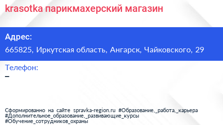 krasotka, парикмахерский магазин по адресу 665825, Иркутская область, Ангарск, Чайковского, 29 в дальнейшем Организация, размещена в следующих категориях: