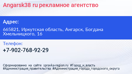 Angarsk38.ru, рекламное агентство по адресу 665821, Иркутская область, Ангарск, Богдана Хмельницкого, 16 в дальнейшем Организация, размещена в следующих категориях: