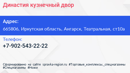 Династия, кузнечный двор по адресу 665806, Иркутская область, Ангарск, Театральная, ст10а в дальнейшем Организация, размещена в следующих категориях: