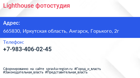 Lighthouse, фотостудия по адресу 665830, Иркутская область, Ангарск, Горького, 2г в дальнейшем Организация, размещена в следующих категориях: