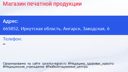 Магазин печатной продукции по адресу 665852, Иркутская область, Ангарск, Заводская, 6 в дальнейшем Организация, размещена в следующих категориях: