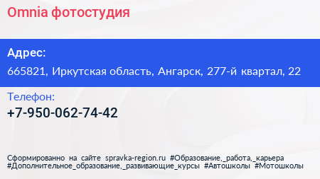 Omnia, фотостудия по адресу 665821, Иркутская область, Ангарск, 277-й квартал, 22 в дальнейшем Организация, размещена в следующих категориях: