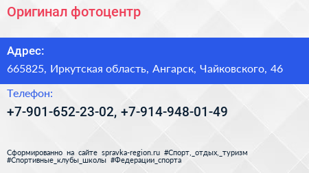 Оригинал, фотоцентр по адресу 665825, Иркутская область, Ангарск, Чайковского, 46 в дальнейшем Организация, размещена в следующих категориях: