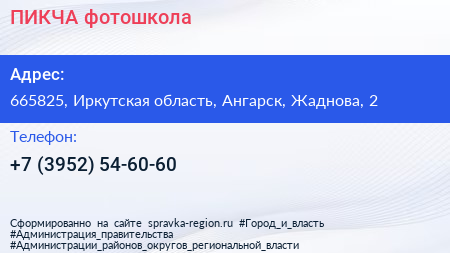 ПИКЧА, фотошкола по адресу 665825, Иркутская область, Ангарск, Жаднова, 2 в дальнейшем Организация, размещена в следующих категориях: