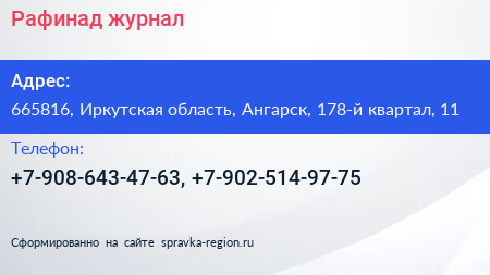Рафинад, журнал по адресу 665816, Иркутская область, Ангарск, 178-й квартал, 11 в дальнейшем Организация, размещена в следующих категориях: