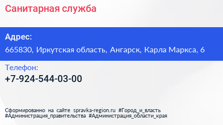 Санитарная служба по адресу 665830, Иркутская область, Ангарск, Карла Маркса, 6 в дальнейшем Организация, размещена в следующих категориях: