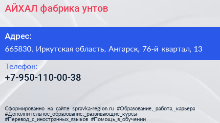 АЙХАЛ, фабрика унтов по адресу 665830, Иркутская область, Ангарск, 76-й квартал, 13 в дальнейшем Организация, размещена в следующих категориях:
