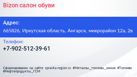 Bizon, салон обуви по адресу 665826, Иркутская область, Ангарск, микрорайон 12а, 2в в дальнейшем Организация, размещена в следующих категориях: