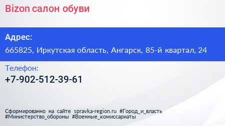Bizon, салон обуви по адресу 665825, Иркутская область, Ангарск, 85-й квартал, 24 в дальнейшем Организация, размещена в следующих категориях: