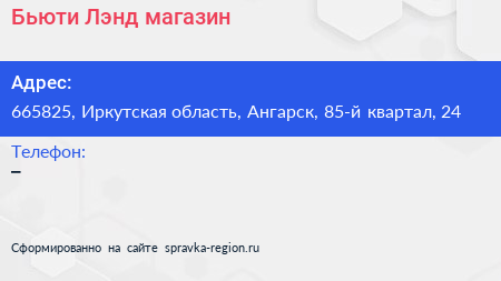 Бьюти Лэнд, магазин по адресу 665825, Иркутская область, Ангарск, 85-й квартал, 24 в дальнейшем Организация, размещена в следующих категориях: