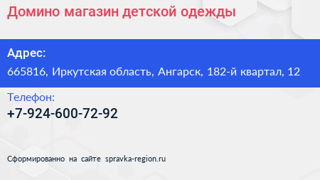 Домино, магазин детской одежды по адресу 665816, Иркутская область, Ангарск, 182-й квартал, 12 в дальнейшем Организация, размещена в следующих категориях: