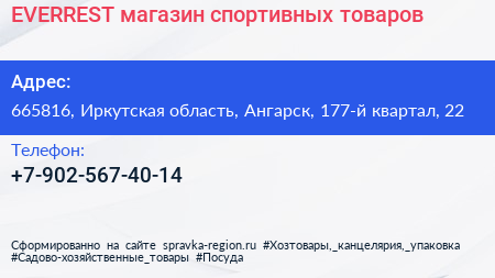 EVERREST, магазин спортивных товаров по адресу 665816, Иркутская область, Ангарск, 177-й квартал, 22 в дальнейшем Организация, размещена в следующих категориях: