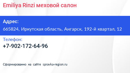 Emiliya Rinzi, меховой салон по адресу 665824, Иркутская область, Ангарск, 192-й квартал, 12 в дальнейшем Организация, размещена в следующих категориях: