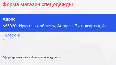 Форма, магазин спецодежды по адресу 665830, Иркутская область, Ангарск, 74-й квартал, 4а в дальнейшем Организация, размещена в следующих категориях: