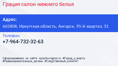 Грация, салон нижнего белья по адресу 665808, Иркутская область, Ангарск, 95-й квартал, 31 в дальнейшем Организация, размещена в следующих категориях: