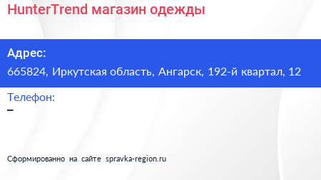 HunterTrend, магазин одежды по адресу 665824, Иркутская область, Ангарск, 192-й квартал, 12 в дальнейшем Организация, размещена в следующих категориях: