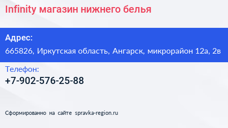 Infinity, магазин нижнего белья по адресу 665826, Иркутская область, Ангарск, микрорайон 12а, 2в в дальнейшем Организация, размещена в следующих категориях: