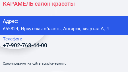 КАРАМЕЛЬ, салон красоты по адресу 665824, Иркутская область, Ангарск, квартал А, 4 в дальнейшем Организация, размещена в следующих категориях: