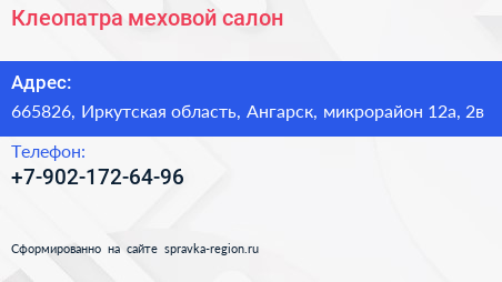 Клеопатра, меховой салон по адресу 665826, Иркутская область, Ангарск, микрорайон 12а, 2в в дальнейшем Организация, размещена в следующих категориях: