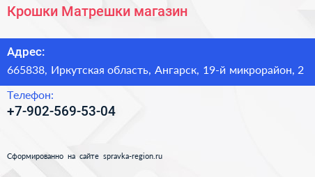 Крошки-Матрешки, магазин по адресу 665838, Иркутская область, Ангарск, 19-й микрорайон, 2 в дальнейшем Организация, размещена в следующих категориях: