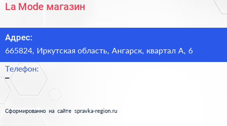 La Mode, магазин по адресу 665824, Иркутская область, Ангарск, квартал А, 6 в дальнейшем Организация, размещена в следующих категориях: