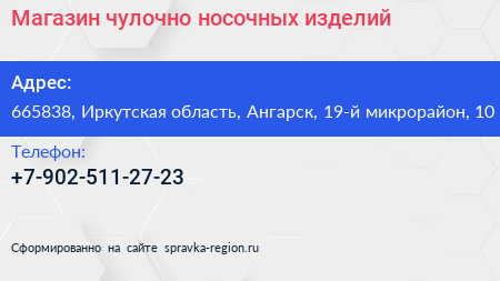 Магазин чулочно-носочных изделий по адресу 665838, Иркутская область, Ангарск, 19-й микрорайон, 10 в дальнейшем Организация, размещена в следующих категориях: