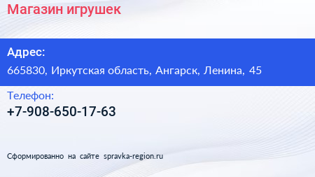 Магазин игрушек по адресу 665830, Иркутская область, Ангарск, Ленина, 45 в дальнейшем Организация, размещена в следующих категориях: