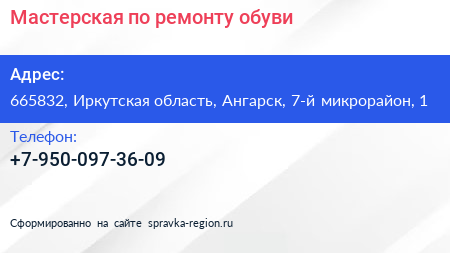 Мастерская по ремонту обуви по адресу 665832, Иркутская область, Ангарск, 7-й микрорайон, 1 в дальнейшем Организация, размещена в следующих категориях: