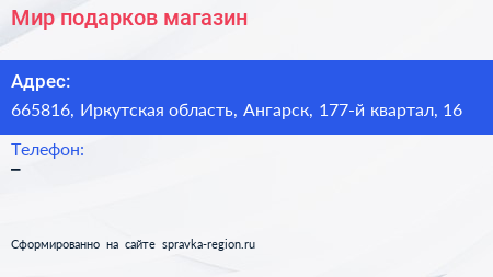 Мир подарков, магазин по адресу 665816, Иркутская область, Ангарск, 177-й квартал, 16 в дальнейшем Организация, размещена в следующих категориях: