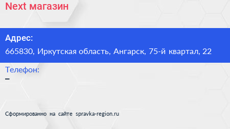 Next, магазин по адресу 665830, Иркутская область, Ангарск, 75-й квартал, 22 в дальнейшем Организация, размещена в следующих категориях: