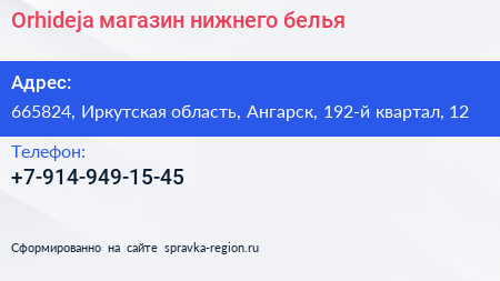 Orhideja, магазин нижнего белья по адресу 665824, Иркутская область, Ангарск, 192-й квартал, 12 в дальнейшем Организация, размещена в следующих категориях:
