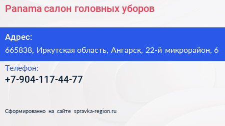 Panama, салон головных уборов по адресу 665838, Иркутская область, Ангарск, 22-й микрорайон, 6 в дальнейшем Организация, размещена в следующих категориях: