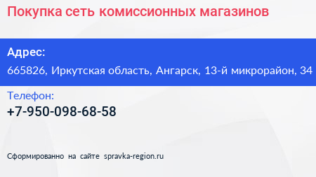 Покупка, сеть комиссионных магазинов по адресу 665826, Иркутская область, Ангарск, 13-й микрорайон, 34 в дальнейшем Организация, размещена в следующих категориях: