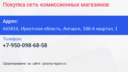 Покупка, сеть комиссионных магазинов по адресу 665816, Иркутская область, Ангарск, 188-й квартал, 1 в дальнейшем Организация, размещена в следующих категориях: