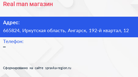 Real man, магазин по адресу 665824, Иркутская область, Ангарск, 192-й квартал, 12 в дальнейшем Организация, размещена в следующих категориях: