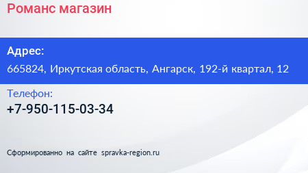Романс, магазин по адресу 665824, Иркутская область, Ангарск, 192-й квартал, 12 в дальнейшем Организация, размещена в следующих категориях:
