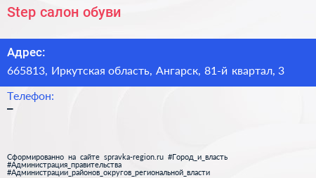 Step, салон обуви по адресу 665813, Иркутская область, Ангарск, 81-й квартал, 3 в дальнейшем Организация, размещена в следующих категориях: