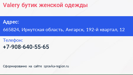Valery, бутик женской одежды по адресу 665824, Иркутская область, Ангарск, 192-й квартал, 12 в дальнейшем Организация, размещена в следующих категориях: