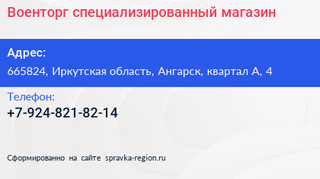 Военторг, специализированный магазин по адресу 665824, Иркутская область, Ангарск, квартал А, 4 в дальнейшем Организация, размещена в следующих категориях: