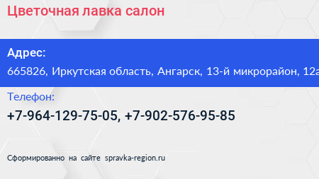 Цветочная лавка, салон по адресу 665826, Иркутская область, Ангарск, 13-й микрорайон, 12а в дальнейшем Организация, размещена в следующих категориях: