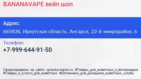 BANANAVAPE, вейп-шоп по адресу 665838, Иркутская область, Ангарск, 22-й микрорайон, 6 в дальнейшем Организация, размещена в следующих категориях: