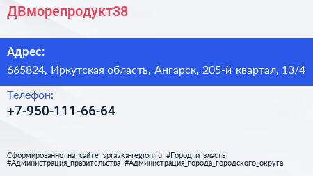 ДВморепродукт38 по адресу 665824, Иркутская область, Ангарск, 205-й квартал, 13/4 в дальнейшем Организация, размещена в следующих категориях: