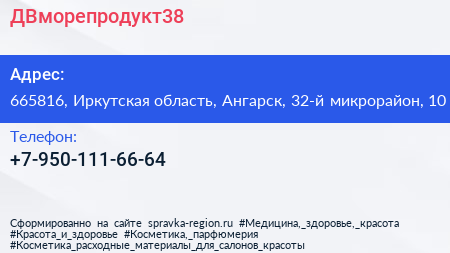 ДВморепродукт38 по адресу 665816, Иркутская область, Ангарск, 32-й микрорайон, 10 в дальнейшем Организация, размещена в следующих категориях: