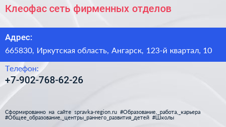 Клеофас, сеть фирменных отделов по адресу 665830, Иркутская область, Ангарск, 123-й квартал, 10 в дальнейшем Организация, размещена в следующих категориях: