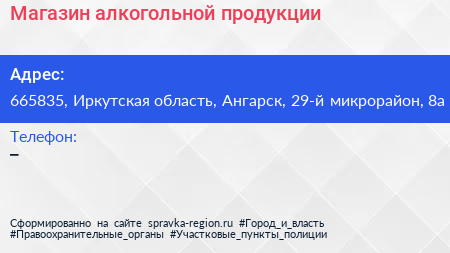 Магазин алкогольной продукции по адресу 665835, Иркутская область, Ангарск, 29-й микрорайон, 8а в дальнейшем Организация, размещена в следующих категориях: