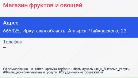Магазин фруктов и овощей по адресу 665825, Иркутская область, Ангарск, Чайковского, 23 в дальнейшем Организация, размещена в следующих категориях: