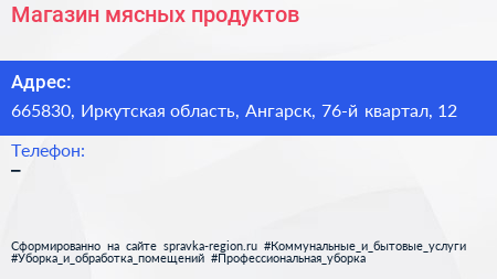 Магазин мясных продуктов по адресу 665830, Иркутская область, Ангарск, 76-й квартал, 12 в дальнейшем Организация, размещена в следующих категориях: